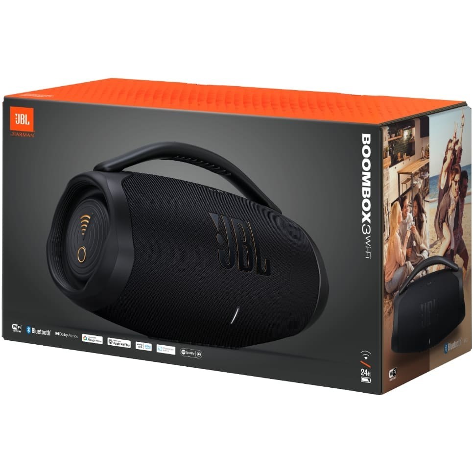 اسپیکر جی بی ال مدل بومباکس 3 وای فای که علاوه بر بلوتوث دارای کانکشن وای فای نیز میباشد, با قدرت خروجی۲۰۰ وات واقعی با قابلیت اپل ایرپلی و گوگل کروم کست و پشتیبانی از دالبی اتموس , عمر باتری 24 ساعته , کاملا ضدآب و نرم افزار اختصاصی JBL one app , نسخه ارتقاع یافته ی بومباکس ۳